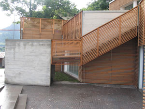 | Viste dell’ingresso del complesso museale riprese dalla sede stradale principale. Il particolare della scala che porta alla terrazza. Fonte: Arch. M. Baldin | ||