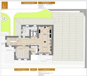 | Vista generale dell’intero complesso museale. Fonte: Arch. M. Baldin | Vista di un interno del piano terra. Fonte: Arch. M. Baldin | Pianta piano terra. Fonte: Arch. M. Baldin |