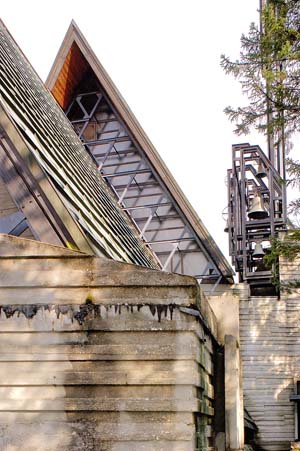“L’edificio ospita un massimo di 350 persone ed ha uno sviluppo planimetrico pari a 850 mq. L’altezza della navata centrale è di 24 metri, mentre quella delle guglia è di 65. In collaborazione con Carlo Scarpa. |